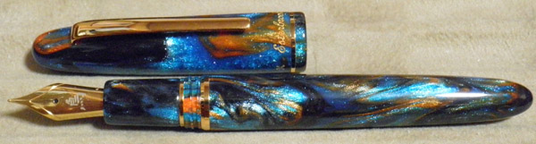 エスターブルックの代表モデルであるエスティーをベースとし、ダイヤモンドの微粉を練り込んだ樹脂を複数色組み合わせており、納得できる物にするため何度も試作を重ねたため、予定よりも延び延びになってしまったとか。我が家の蛍光灯の光で撮っているため、この美しい色が上手く表現できないのが残念。